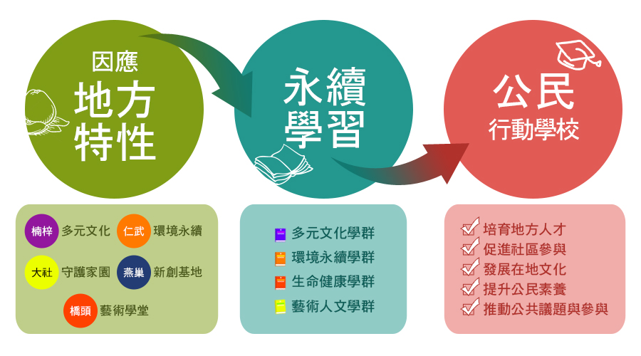 - 學區內因著產業發展與聚落變遷,在課程規劃上因應行政區需求與現況,設置學群經理人,推動發展多元學習課程。